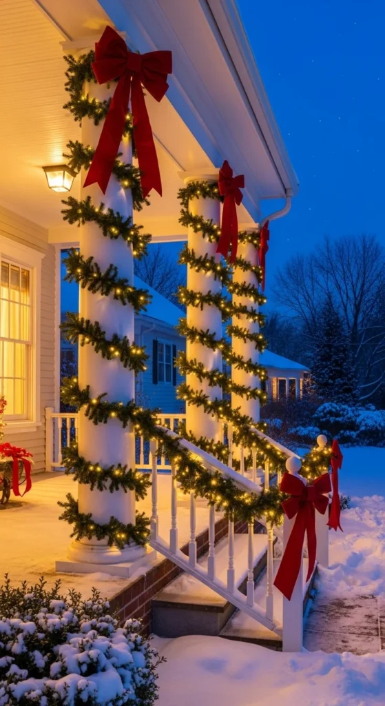 Wrap porch columns in garland and add large red bows at the top. Tie a second bow halfway down if your columns are tall. If you do not have columns, tie bows around porch railings or mailbox posts. Velvet-style ribbon gives a rich look. This is one of the simplest ways to style your entry but looks stunning from the street.