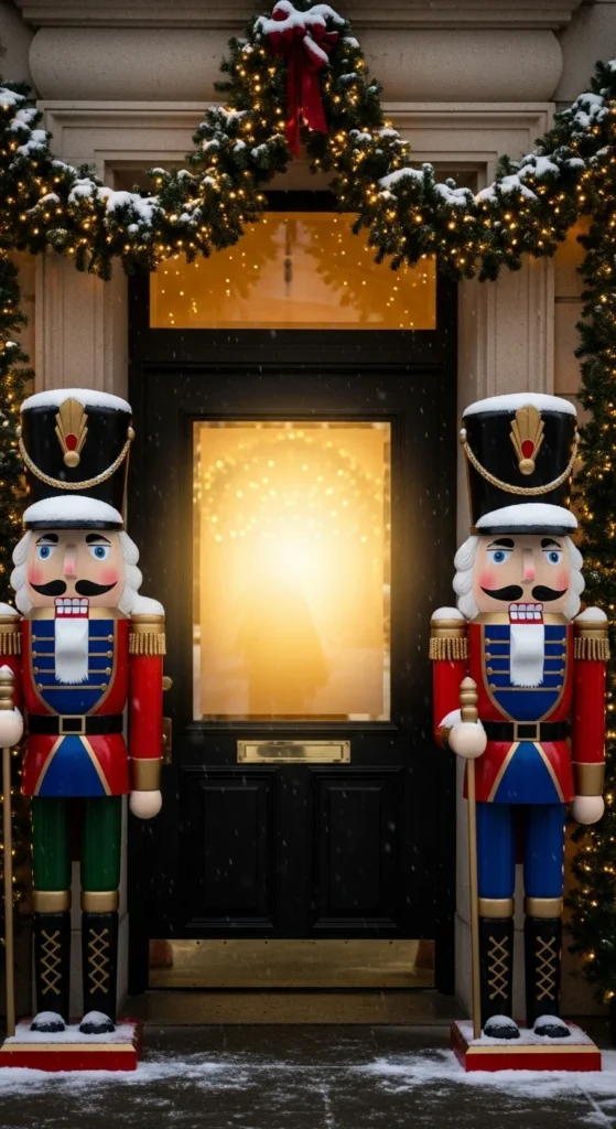 Place tall nutcrackers at your entry. They bring playful charm. If life-size versions cost too much, place medium-size ones on stools to increase height. Spray a clear sealant if they sit outside. Add a spotlight below for nighttime drama. Children love this idea, and it pairs well with classic wreath and gold lights.