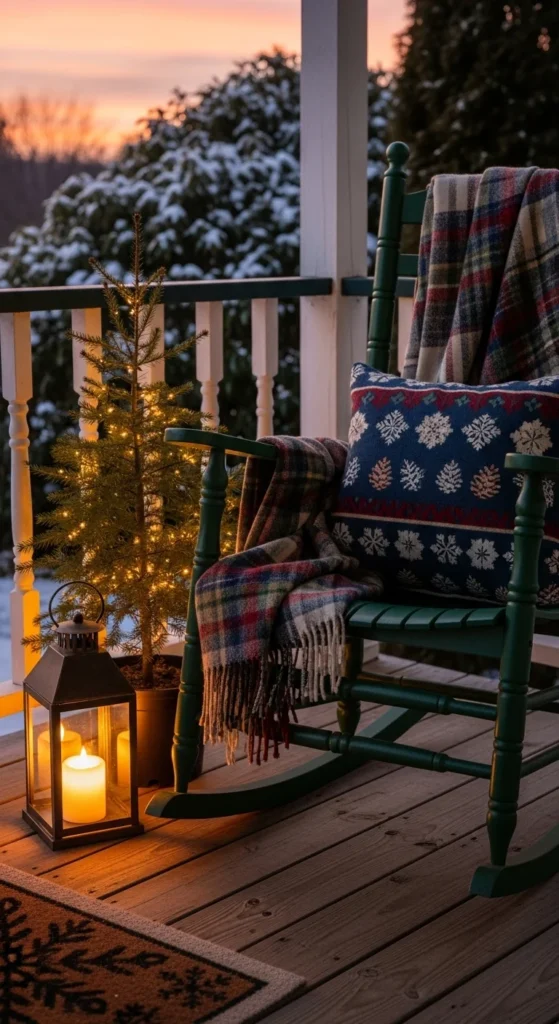 Create a cozy seating moment outside. Place a rocking chair or bench on the porch. Add a plaid throw and pillow for warmth. Surround it with lanterns and a small potted pine tree. This idea makes your space feel lived-in and charming. Keep fabric indoors during snowstorms or choose weather-safe textiles.