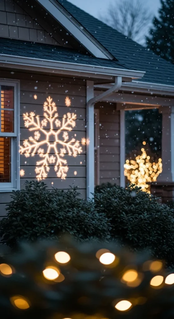 Use a snowflake projector to wash your home in floating snowflakes. Set it to slow movement for a calm effect. Angle slightly upward for even coverage. Projectors cover large areas, making them perfect for bigger yards. Pair with minimal lights so the snowflakes remain the focus. Stake into ground and cover cords.