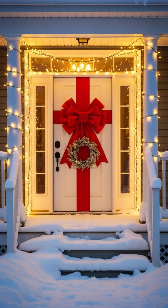 Wrap your door with wide ribbon to look like a gift. Add a giant bow in the center. Use outdoor-safe adhesive hooks or magnets. If you have French doors, wrap each pane individually for a stylish twist. This cheerful trick is inexpensive but stands out in neighborhoods.