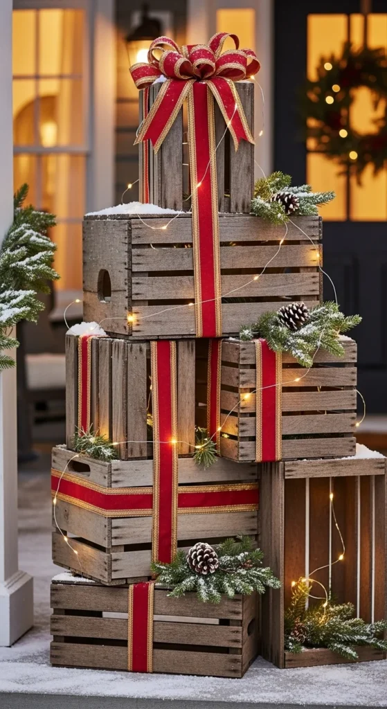 Stack wood crates on porch. Wrap ribbon around each like gifts. Add fairy lights and tuck pine branches between crates. If you can’t find crates, use cardboard boxes wrapped in waterproof gift wrap. This arrangement feels rustic and sweet. Keep it under covered porch during rain.
