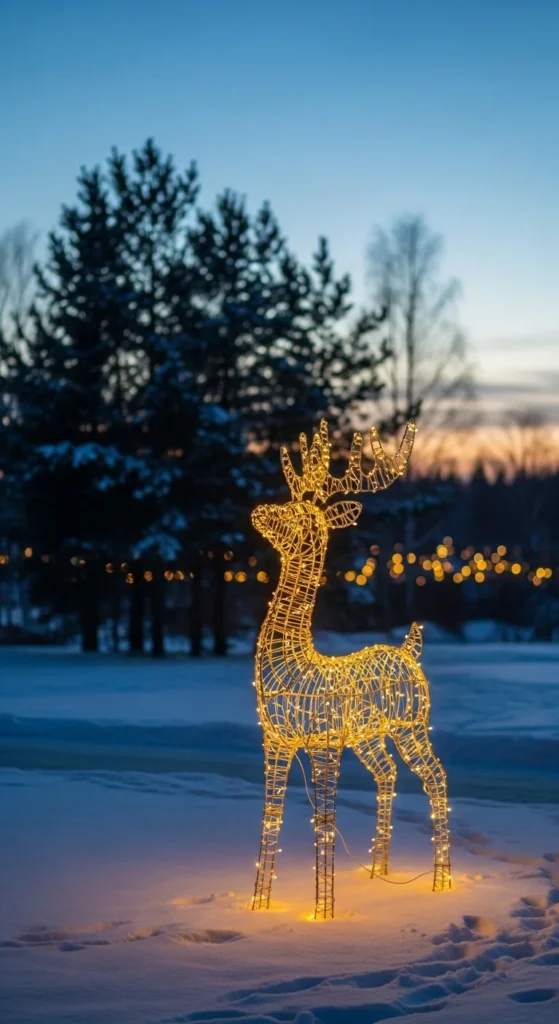Place wire-frame reindeer in your yard. Choose warm white lights for a classy look. Add one large and one smaller reindeer for natural scale. You can DIY by shaping wire fencing into forms and wrapping in lights. Anchor with yard stakes. Place near shrubs to look like they are grazing.