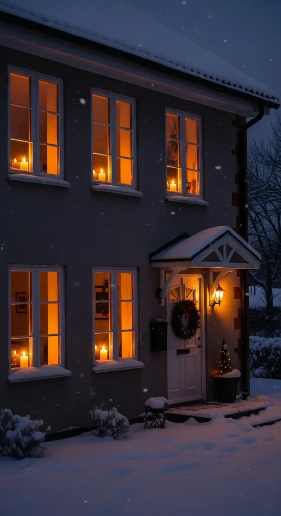 Place one candle light in each window. This simple tradition feels elegant and calm. Battery window candles with timers are convenient. Use gold or black bases for a classic touch. Pair with simple wreaths or garland to complete the look.