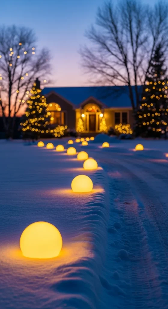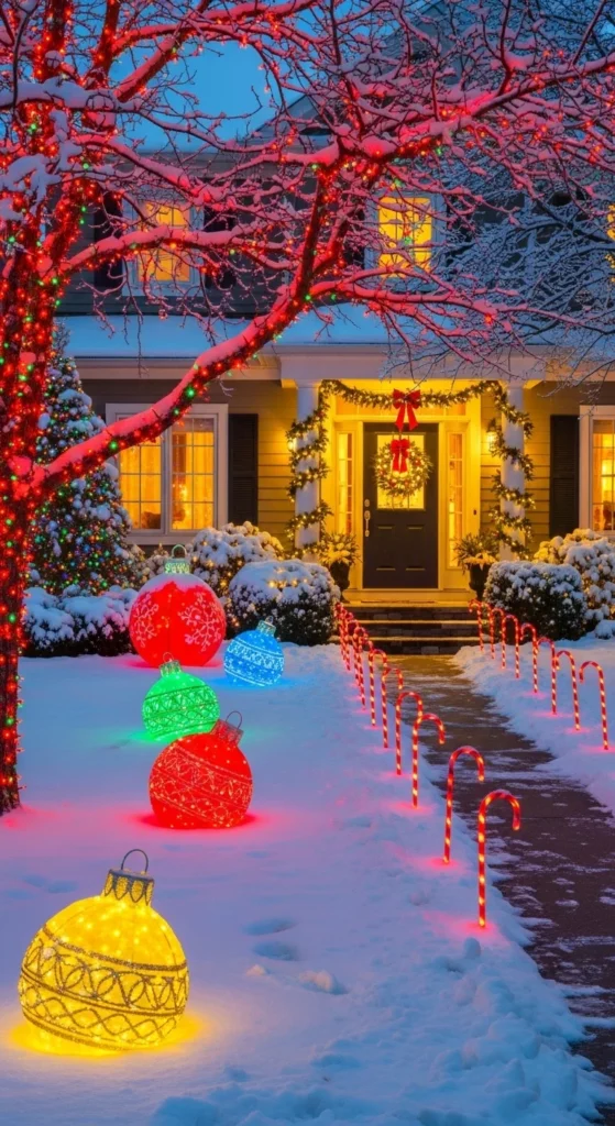 Place oversized ornaments in groups of three or five on your lawn. You can buy them or DIY them by adding ornament hooks to plastic toy balls and spray painting them metallic red, gold, or green. Anchor them with tent stakes so they don’t roll. A cluster near your entry adds drama. You can also pile them into a large decorative basket at your doorstep. Glossy finishes bring sparkle during the day, while fairy lights reflect off the surfaces at night. This trick feels playful yet classy. Keep them dry by storing inside after snow.