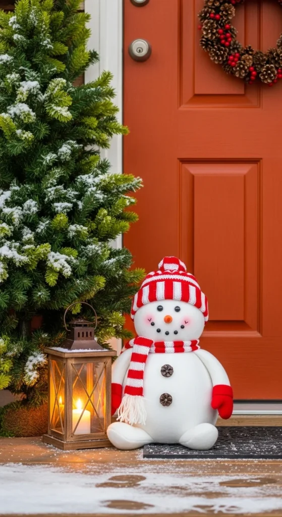 Add a cheerful snowman next to your door. Choose a wooden, fabric, or resin version. DIY with stacked white buckets painted and tied with ribbon. Add scarf and hat for charm. Place beside potted evergreens and lanterns. Kids find it delightful, and it adds personality.