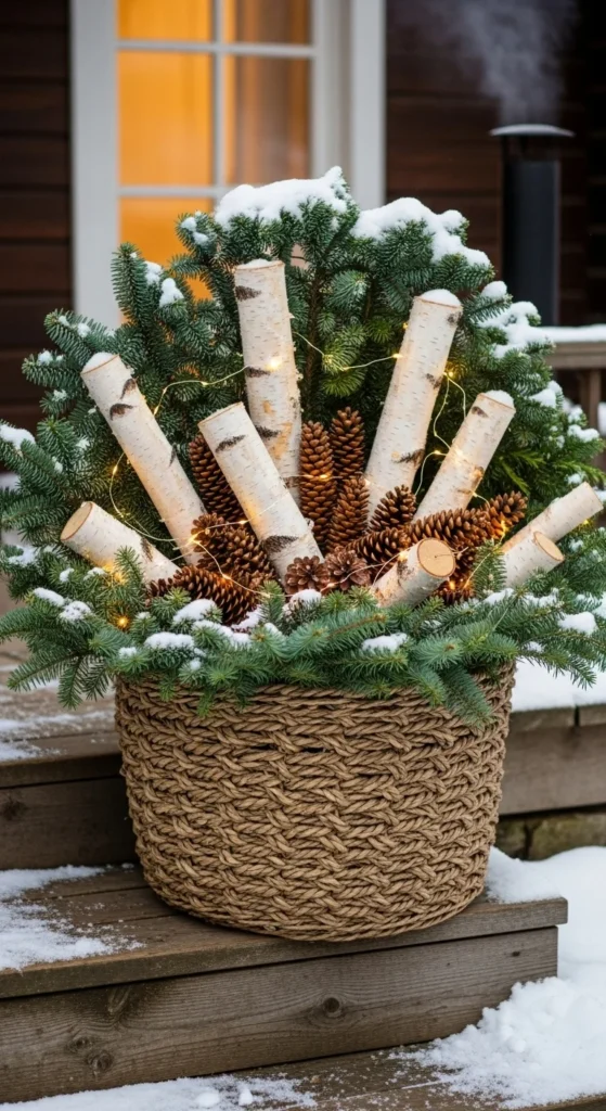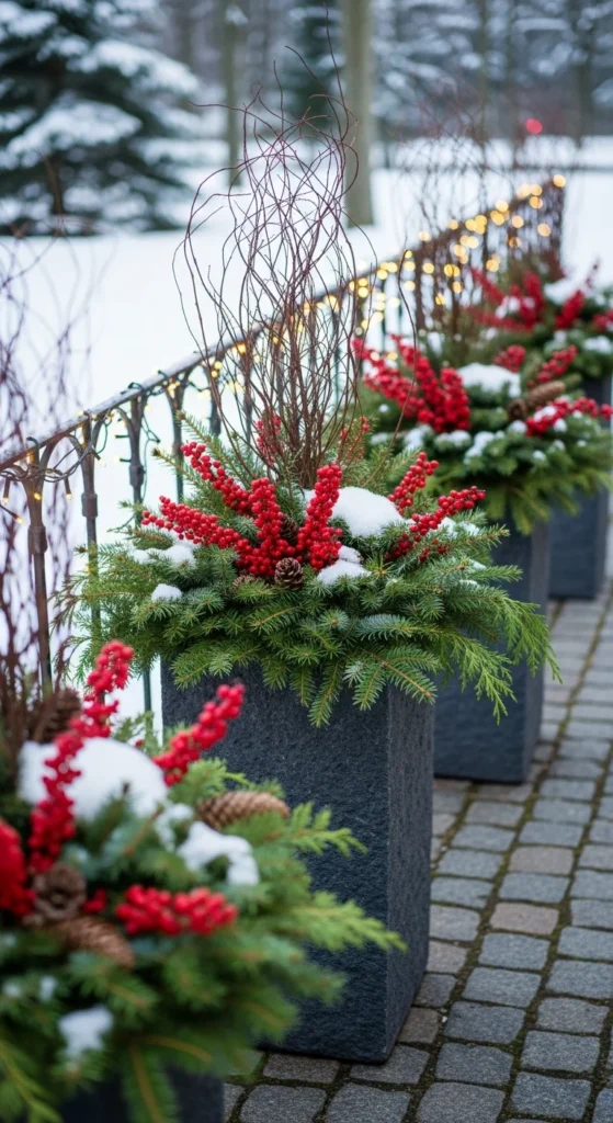 Fill large outdoor planters with evergreen branches. Add berry stems, twigs, and pinecones. Push floral foam inside pots to hold stems upright. Wrap small battery lights around branches for extra sparkle. This method works if you don’t have live plants outside during winter. Keep planters near entry for natural charm.