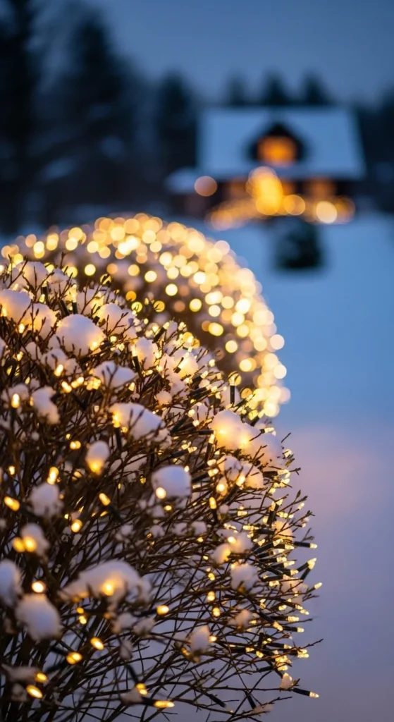 Wrap bushes in fairy lights for a cozy glow. Spread bulbs evenly to keep the look tidy. Warm white feels classic. If you want playful color, use multicolor mini bulbs. Use net lights for quick setup. Secure cords neatly so they don’t distract. This lighting pairs well with star roof decor or porch garland.