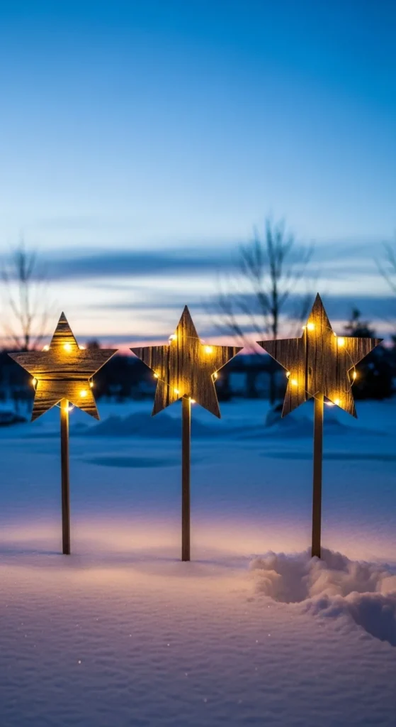 Cut wooden stars or buy unfinished craft stars. Attach to stakes and push into lawn. Wrap with lights. Leave wood natural or paint soft white. Arrange in a row or cluster. This idea feels handmade and charming. It works especially well with rustic garlands or lanterns.
