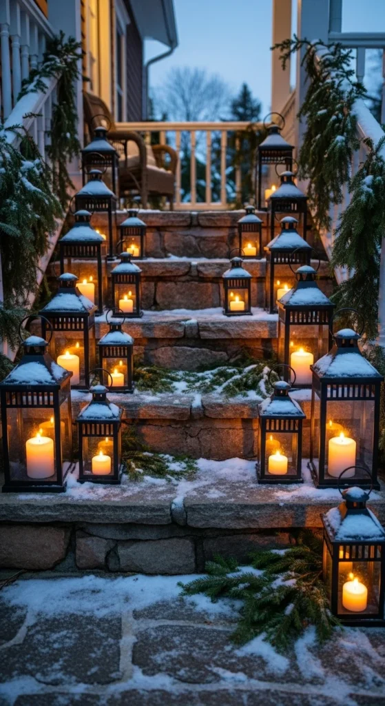 Layer lanterns along your stairs or porch steps. Mix sizes and shapes for interest. Use flameless candles for safety. Add sprigs of greenery around the base for texture. Tie small ribbons on handles if you like a festive touch. Place lanterns only along one side for balance in narrow spaces. You can find lanterns at thrift stores and spray paint them matte black or brushed gold. This setup works beautifully paired with garland or wreaths. It brings warmth before anyone even walks inside.