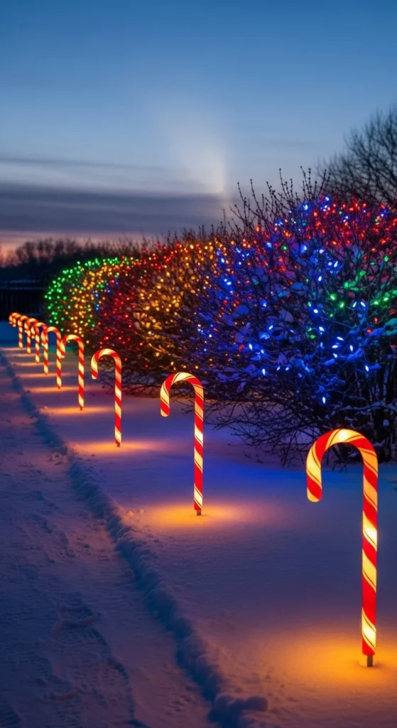 Place candy cane stakes along walkways or driveway borders. Choose illuminated versions for nighttime charm. Space them evenly so the look stays neat. Group them in pairs on each side of the walk for symmetry. If you want budget style, buy plain stakes and wrap with red ribbon and lights yourself. This classic touch always delights kids and families walking by.