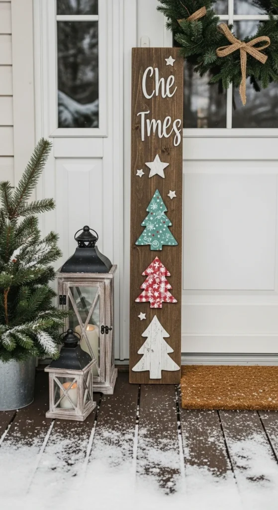 Make or buy a rustic wood sign that leans by the door. Themes like trees, snowflakes, or reindeer work well. Keep colors simple — white paint on natural wood feels timeless. Seal it for weather protection. If you like a cozy farmhouse vibe, add a plaid bow or jute rope. Place small pine branches around the base. Store indoors during storms for long use.