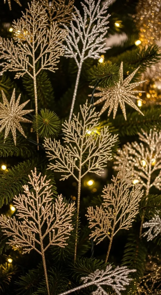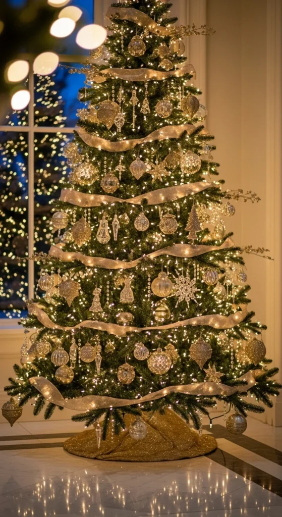A gold and glass ornament tree creates quiet sophistication. Start with warm fairy lights and layer gold balls in different finishes—matte, mirrored, glittered. Mix in clear glass or crystal pieces to add sparkle without clutter.