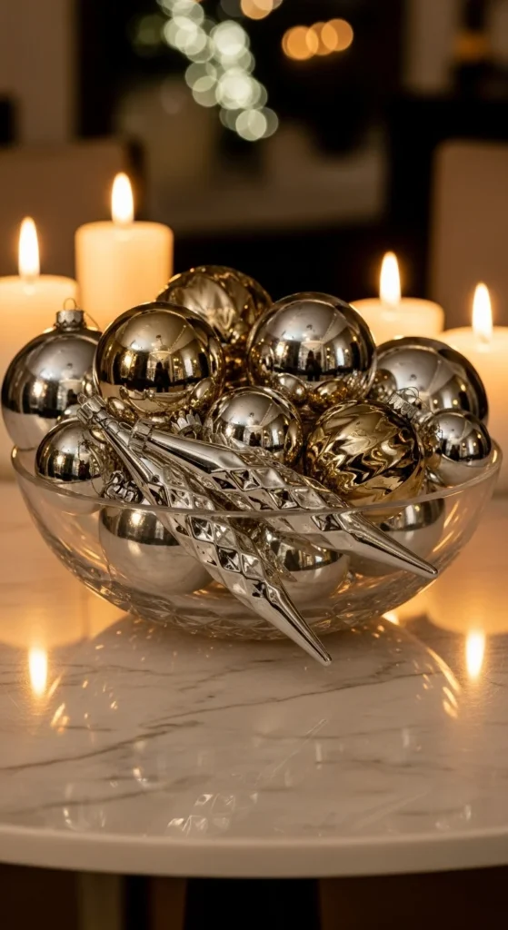 Fill a crystal bowl with mirrored ornaments. Mix gold and silver for depth.