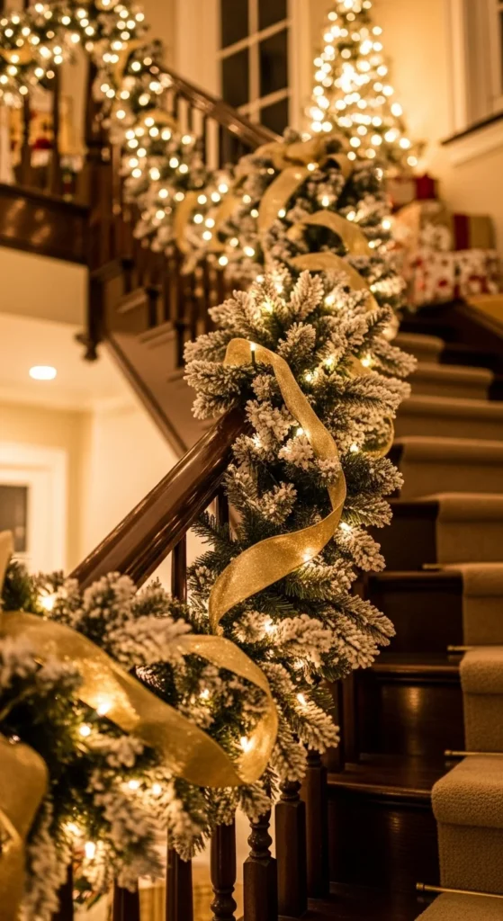 Flocked greenery feels snowy and soft. Drape it along the railing and layer ribbon in loops.