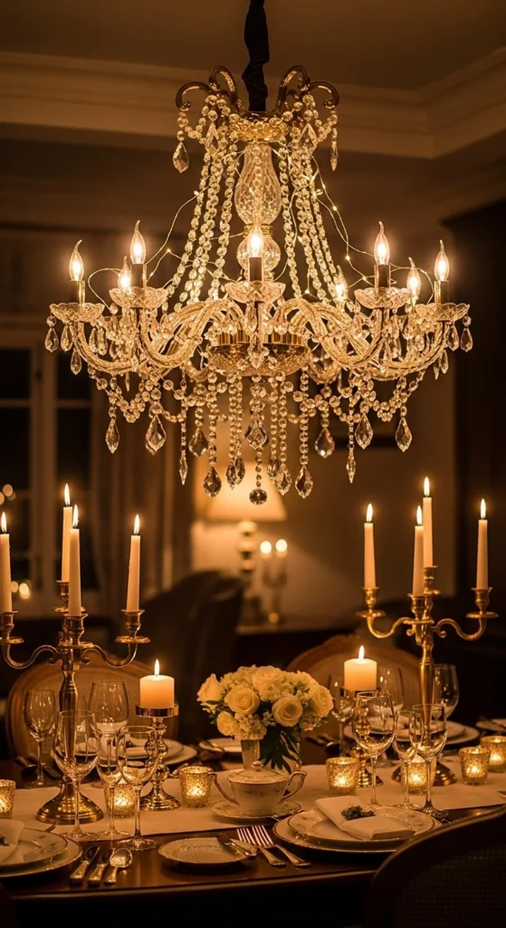Wrap crystal garland around a chandelier. Add tiny fairy lights for extra sparkle.