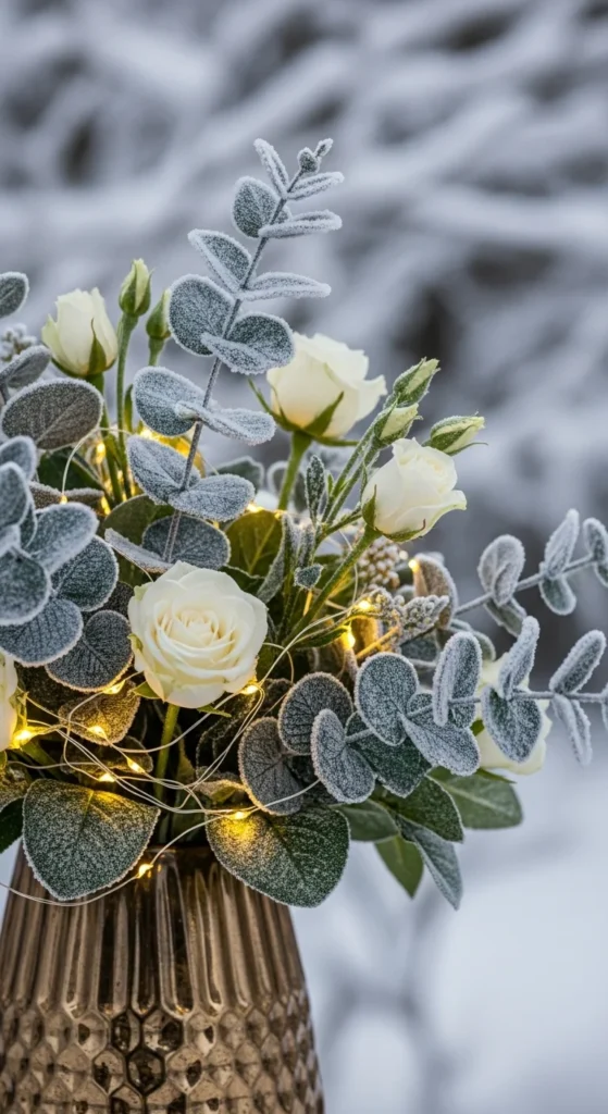 Arrange frosted eucalyptus with white roses in a gold vase.