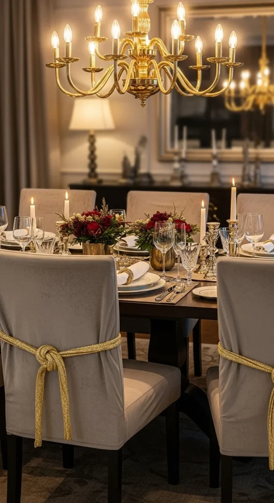 Slip velvet covers over dining chairs. Add gold ribbon ties or brooch accents.
