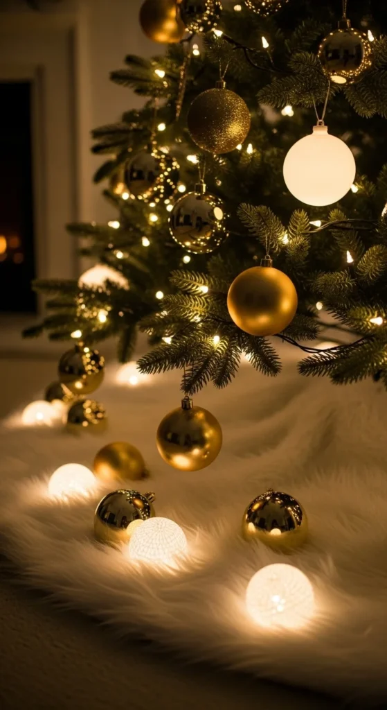 A luxe faux fur skirt makes a tree feel rich and grounded. Choose creamy white or soft champagne tones.