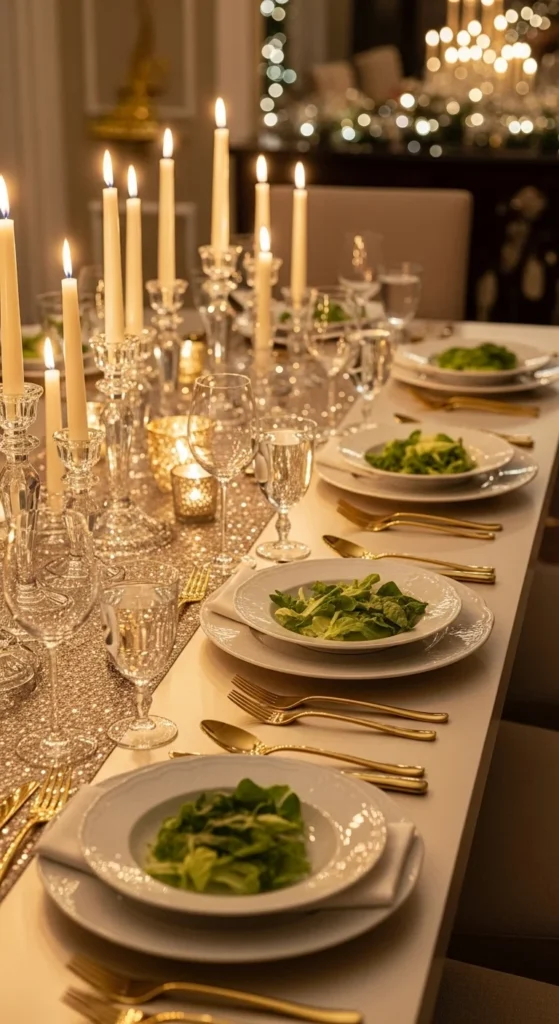 Layer a champagne metallic runner down the dining table. Add white dishes, gold flatware, and crystal glasses for a polished layout.