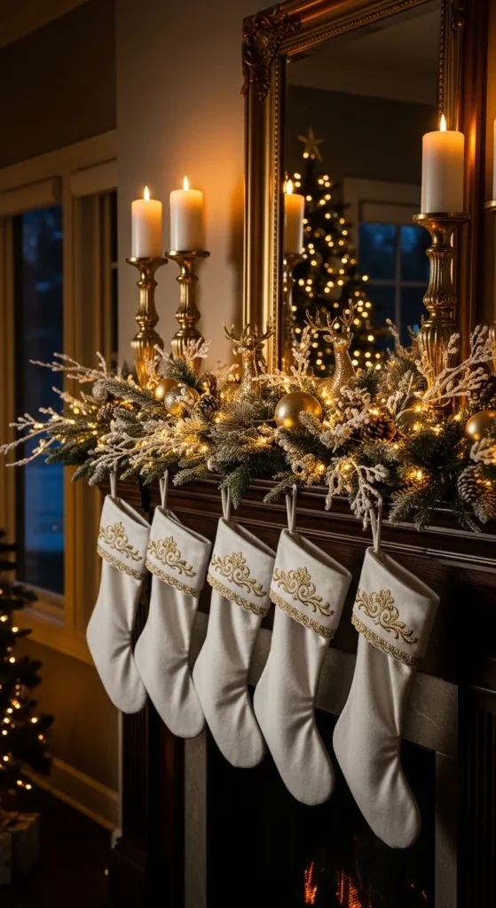 A white and gold palette feels polished and calm. Mix snowy greenery, gold bells, and white knit stockings.