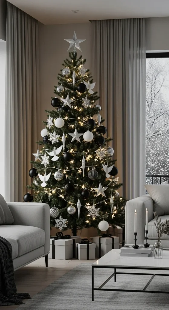 Monochrome is dramatic yet chic. Stick to black, white, and silver. Play with textures like glossy, matte, and glittery ornaments. DIY idea: Paint inexpensive ornaments or cut shapes from cardboard. Monochrome trees stand out in modern spaces and create a bold, elegant statement without expensive materials.
