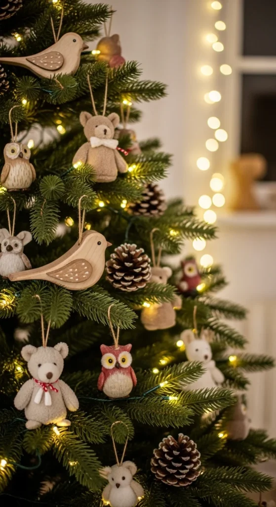 Add woodland creatures for a playful touch. Small plush animals, wooden birds, or felt deer create a storybook vibe. Pinecones and natural branches complement the theme. DIY-friendly: craft paper owls or foxes and hang with string. Great for homes with children or nature lovers.
