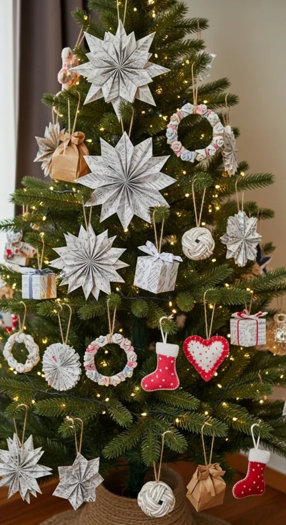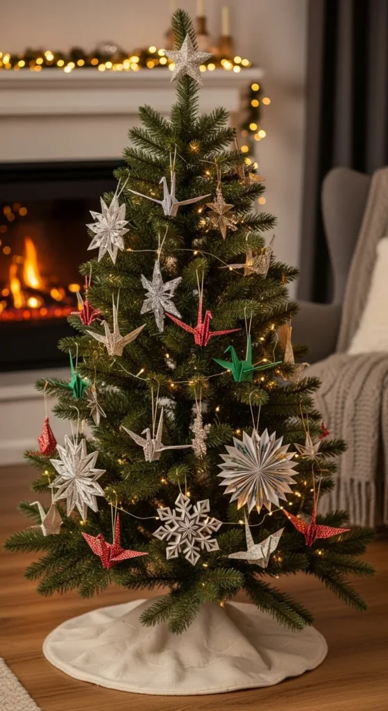 Get creative with paper crafts. Fold stars, snowflakes, or origami shapes and hang them with string. Add colorful or metallic paper for variety. This is affordable and fun for family crafting. The tree becomes interactive and uniquely personal.