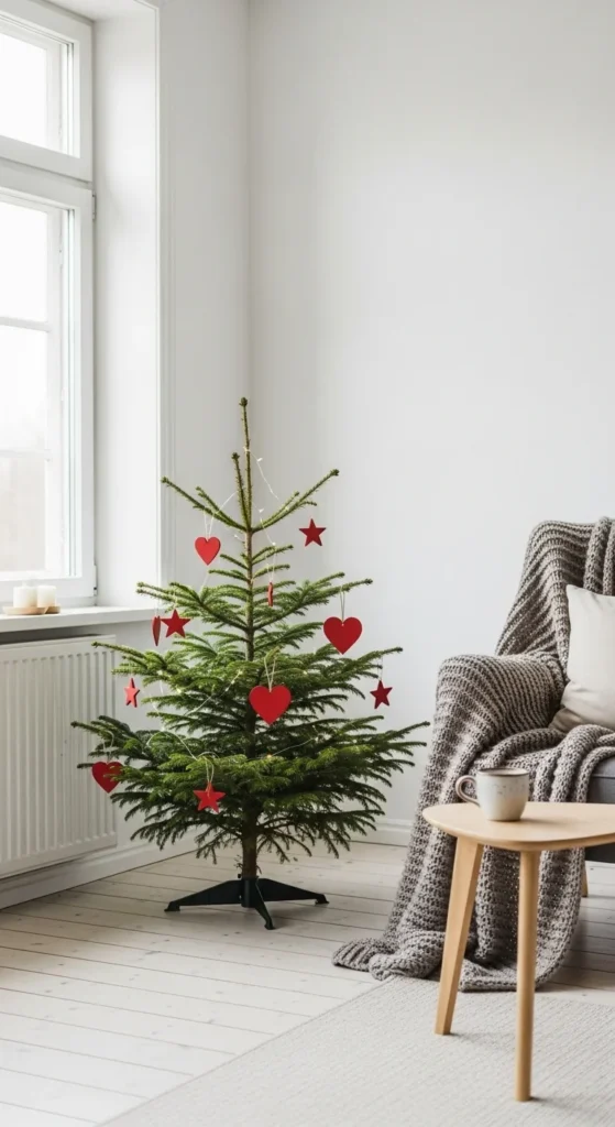 Scandinavian decor favors simplicity. Use wooden or handmade ornaments with red accents. Keep lights minimal. DIY options include felt stars, small paper hearts, or knitted figures. The focus is on simplicity and charm, making it perfect for small apartments or anyone who prefers clean, uncluttered aesthetics.