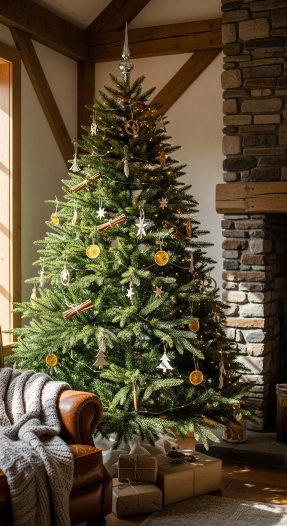 Celebrate nature with earthy tones. Use wooden ornaments, dried citrus slices, cinnamon sticks, or small pinecones. Wrap with thin jute string or burlap ribbon. The mix of textures brings a warm, organic feel. DIY-friendly and inexpensive, this style connects your holiday decor with the outdoors. Small additions like sprigs of eucalyptus or dried flowers can add depth and fragrance to your tree.