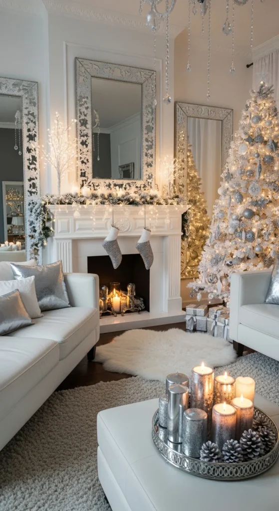 White-on-white decor feels peaceful and refined. Think of soft snowdrifts translated into your living space — fluffy rugs, white garlands, and twinkling silver accents. This theme pairs beautifully with natural greenery for contrast. It’s especially stunning in rooms with lots of sunlight or pale walls.