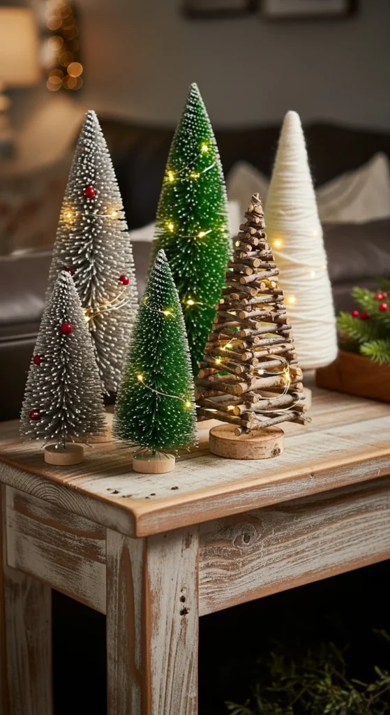 If you don’t want a large tree, use multiple small trees instead. Mix bottlebrush trees, mini pines, and ceramic ones on shelves or tables. Add twinkle lights and tiny ornaments. This approach brings charm and dimension without overwhelming small spaces.
