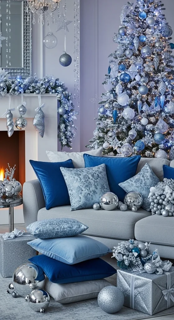For a classy yet cool look, pair icy blue and silver together. Use soft fabrics like velvet and satin to reflect light beautifully. Add metallic touches through ornaments and vases. It’s chic, calm, and perfect for those who prefer understated beauty.