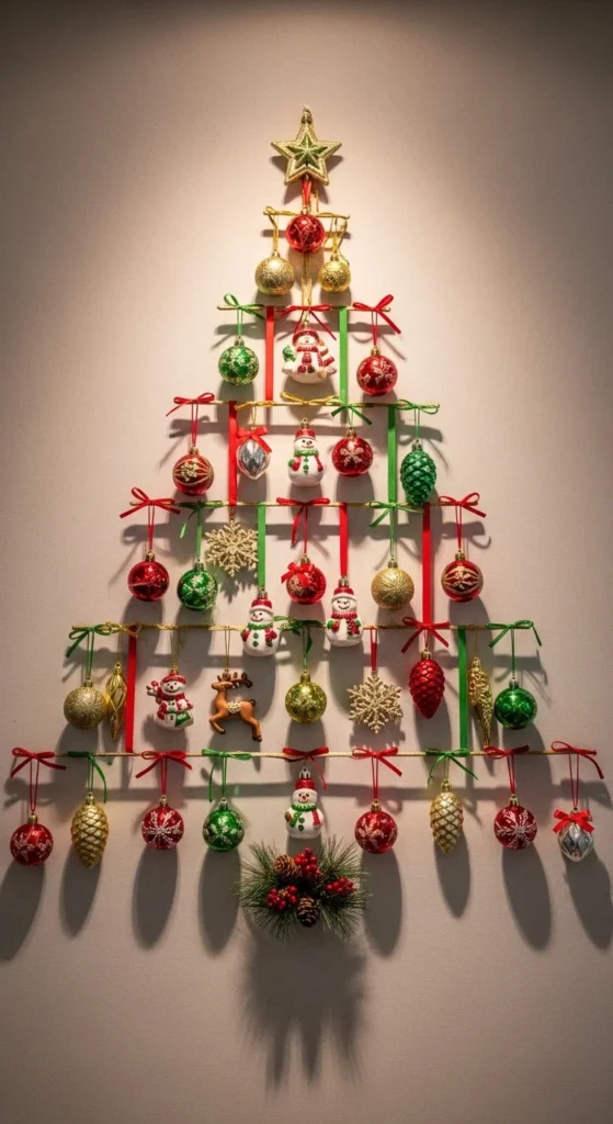 Turn a plain wall into a DIY statement by hanging ornaments in a tree pattern. Use different sizes and textures, and tie them with ribbons for color. It’s space-saving, creative, and completely personalizable.