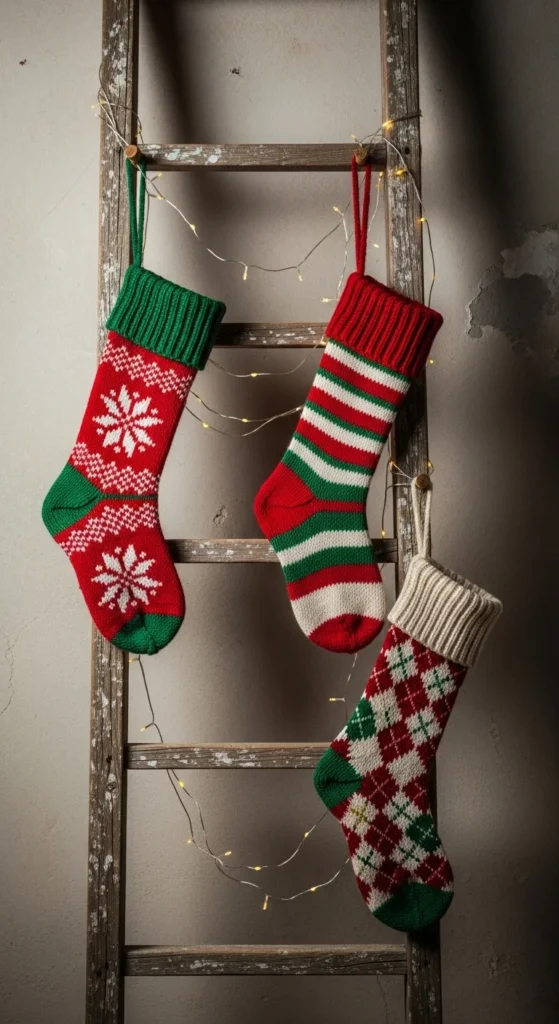 Instead of the usual mantle, hang stockings from a rustic ladder. It’s practical for small spaces and adds height to your setup. Wrap the ladder in lights for extra sparkle.