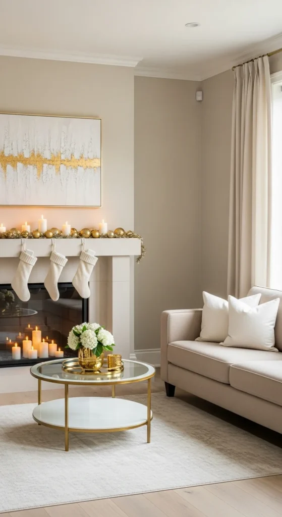 If you prefer a calm and elegant holiday vibe, go for neutral decor with hints of gold. Use beige, ivory, and soft gray as your base, then layer in metallic touches like gold candle holders or baubles. Add plush throws and sheepskin rugs for warmth. This look feels serene yet festive — perfect for smaller spaces that benefit from light tones and gentle shimmer.