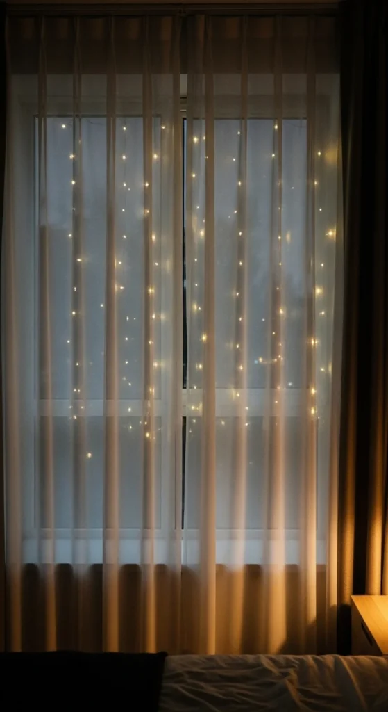 Hang string lights behind sheer curtains for a magical glow. It adds softness and dimension to the room, especially after dark. Perfect for apartments or rooms without fireplaces.