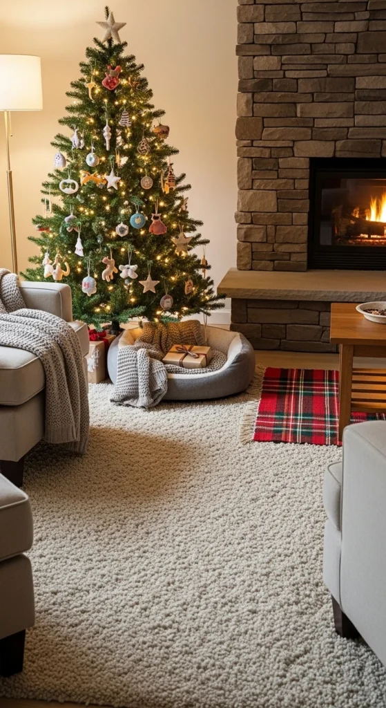 Decorate with your furry friends in mind. Use shatterproof ornaments, avoid candles on low tables, and add a cozy pet bed nearby. It keeps your space festive and safe for everyone.