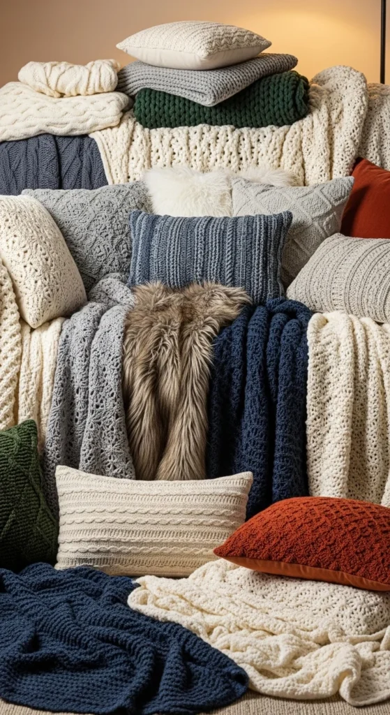 Add layers of knitted decor for tactile coziness. Pillows, throws, and stockings all in chunky patterns bring warmth. Stick to one color family — cream, gray, or blush — to keep it polished.