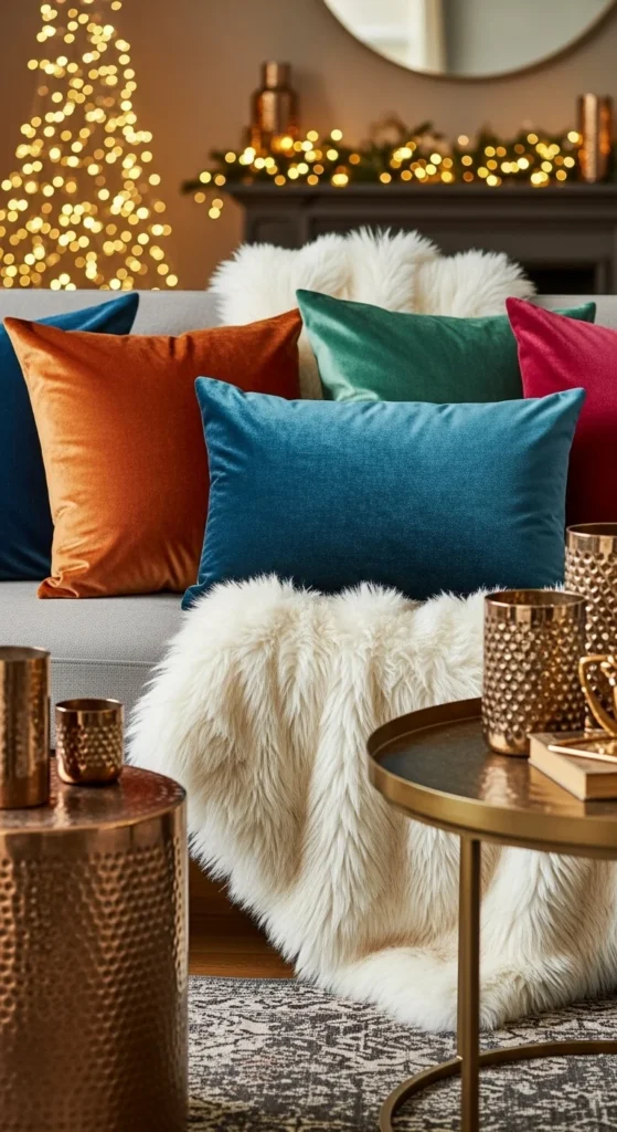 Texture layering makes any space feel upscale. Pair velvet pillows in deep tones like emerald, aubergine, or charcoal with soft faux-fur throws. Keep color palette tight — two or three tones only.