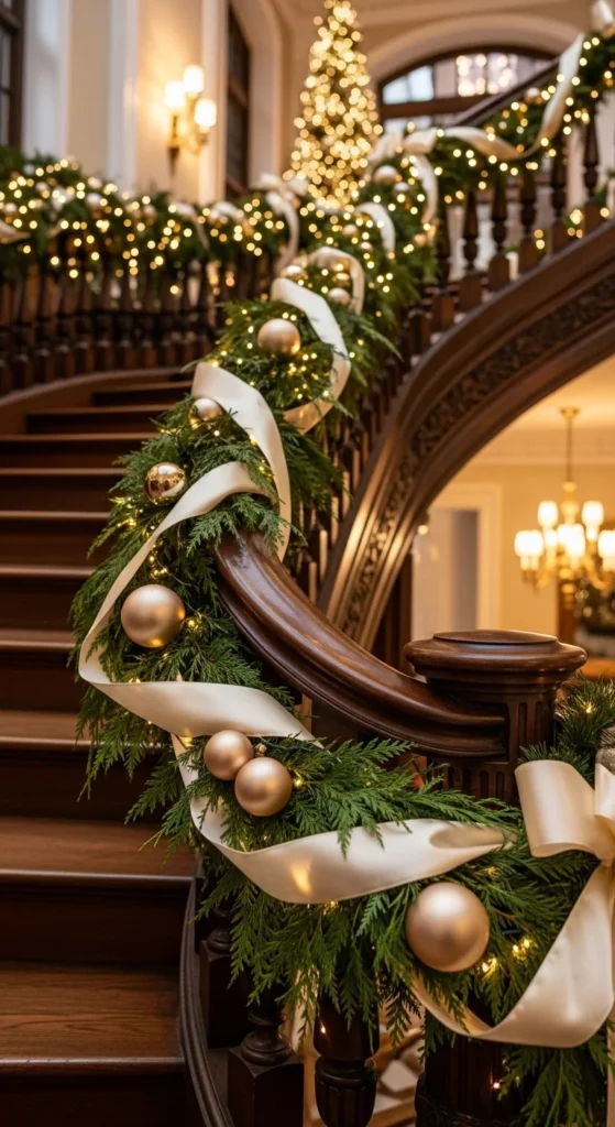 Your entry sets the tone, and a dramatic staircase garland creates instant elegance. Use layered greenery, silk ribbon tails, and scattered pearl or gold ornaments. Let ribbon trails fall long instead of forming big bows.