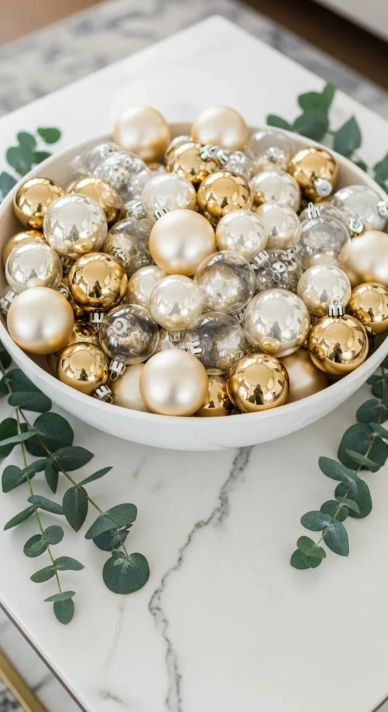A simple bowl arrangement can feel elegant when styled right. Use a white or marble bowl and fill with pearl, gold, and glass ornaments in mixed finishes — matte, brushed, and glossy. Add one sprig of eucalyptus or gold leaf stem for accent.