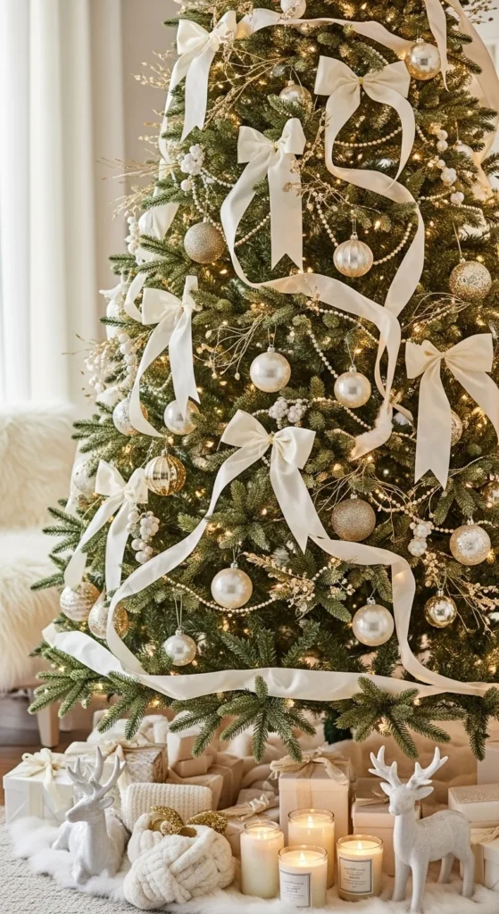Pearl accents feel elegant and timeless. Use pearl ornaments, pearl garland strands, and satin ribbon loops. Stick to cream, champagne, and soft gold tones. Keep lighting warm for softness.