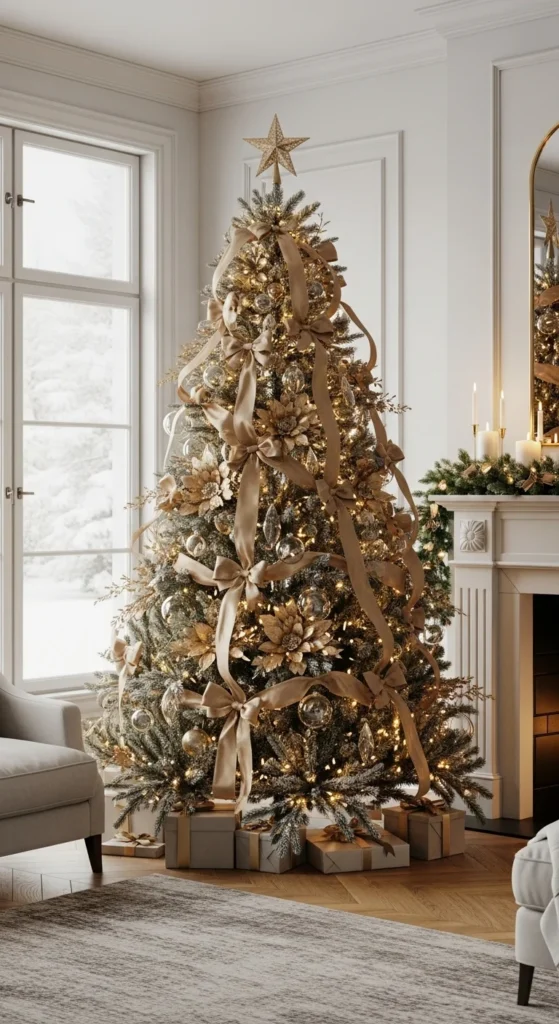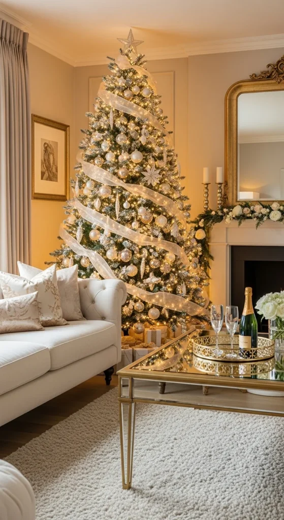 White and gold create timeless holiday harmony. Use warm lights, pearl ornaments, and brushed gold baubles. Add sheer ribbon loosely draped — not tightly wrapped. Keep ornament palettes simple: white, gold, clear glass.