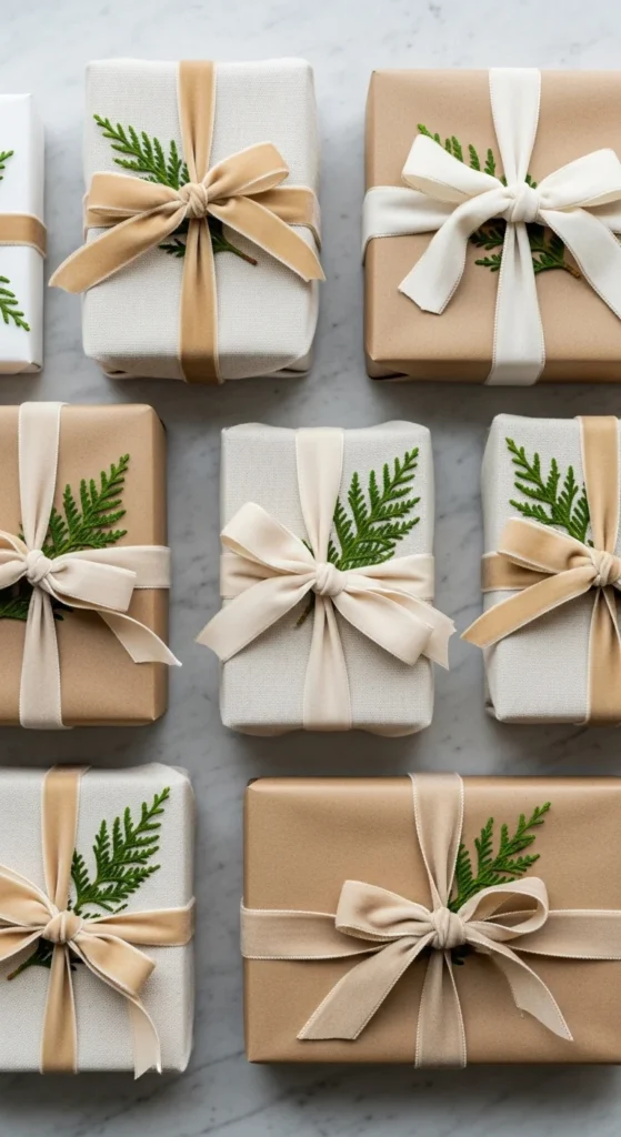 Gifts become decor when wrapped beautifully. Use linen, kraft paper, or muslin wraps. Tie with satin or velvet ribbon in champagne and gold. Add tiny cedar sprigs or dried orange slices.