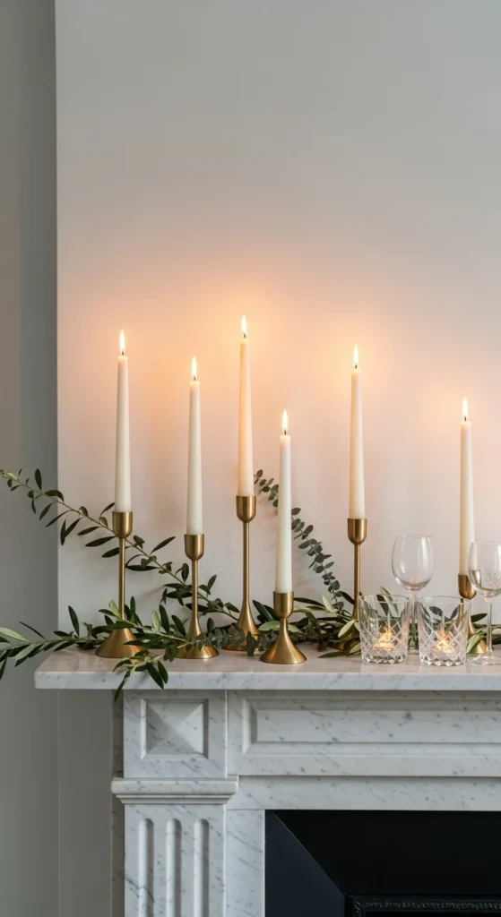 Add tapered candles on the mantle to complete layered glow.