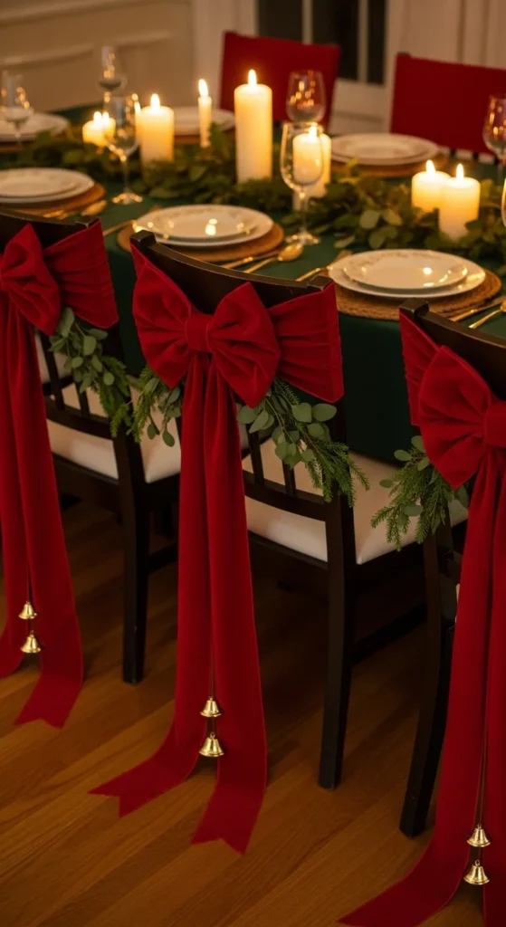 Chair decor often gets overlooked, yet it creates an instant luxe dining mood. Wrap wide velvet ribbon around each back and let tails drape long. Tie bells or a single cedar sprig for refined touch. Choose ribbons in soft gold, hunter green, merlot, or ivory.