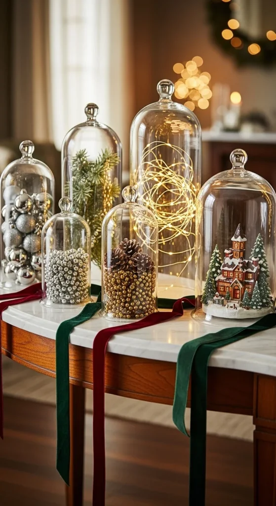 Cloche decor creates museum-style beauty. Fill glass domes with mini ornaments, tiny fairy lights, pearl beads, or natural pine sprigs. Keep contents cohesive and minimal — elegant styling avoids clutter.