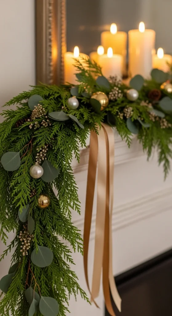 Luxe garlands are soft, full, and natural — not glitter-covered. Use cedar, pine, and eucalyptus. Let greenery drape, not stiffen. Add a few pearl ornaments or brushed gold spheres in small clusters. Skip bright reds or oversized baubles.