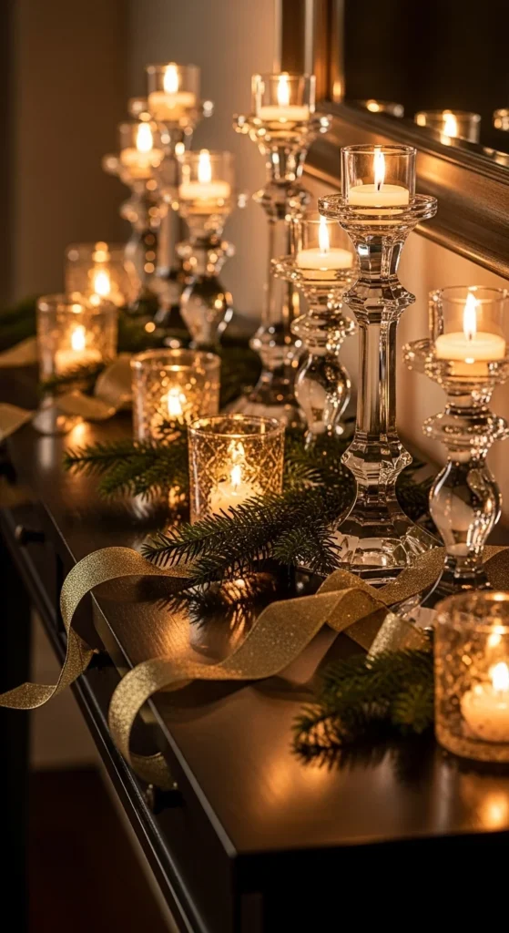 Crystal and clear glass create refined glow. Mix tall crystal stems with short glass votives for layered shine. Keep shapes clean — slender silhouettes feel chic, not loud. Use warm candlelight to soften the crystal sparkle.